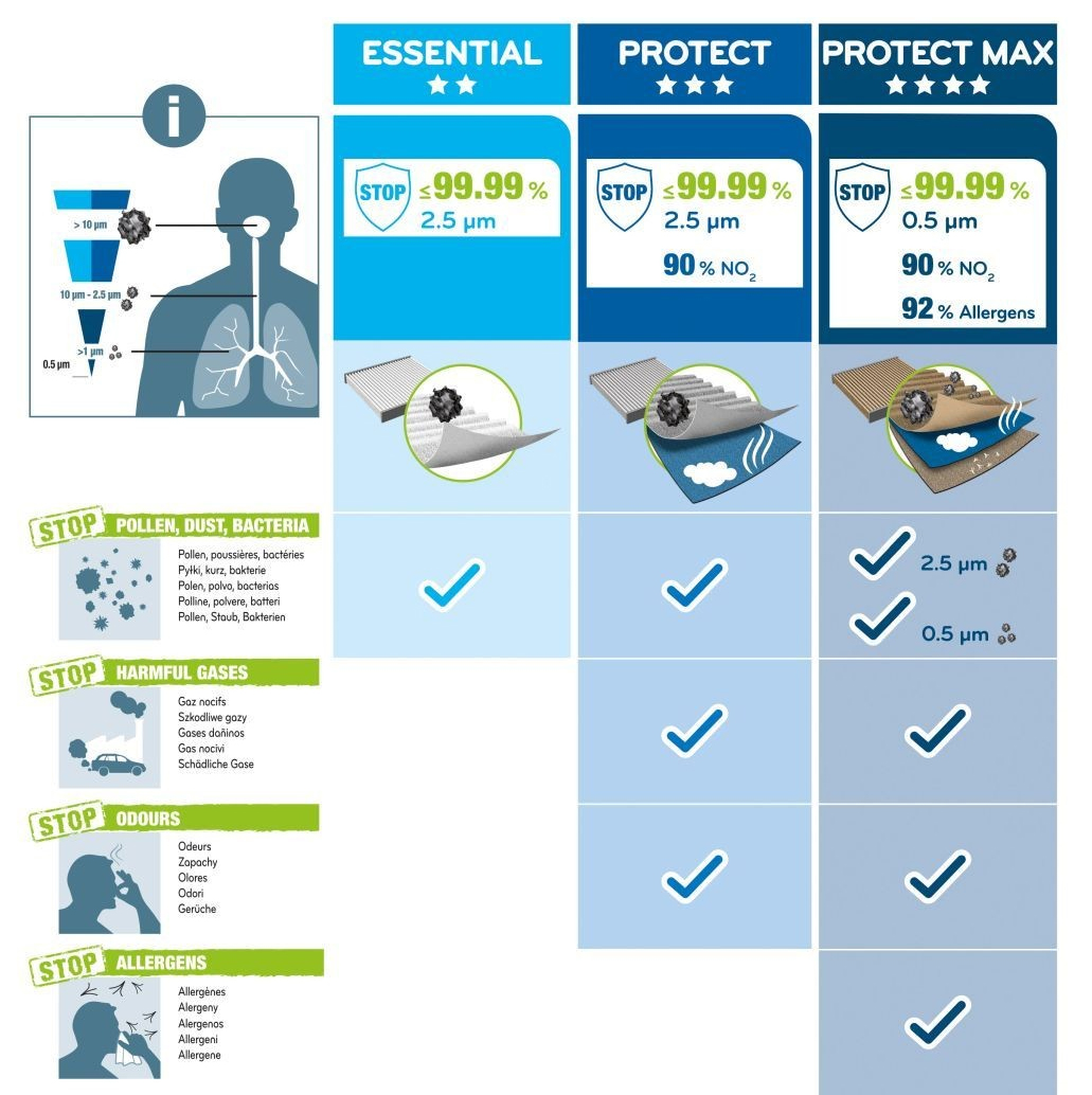 Kabinové filtry značky Valeo se dělí do 3 kategorií podle stupně ochrany posádky vozu